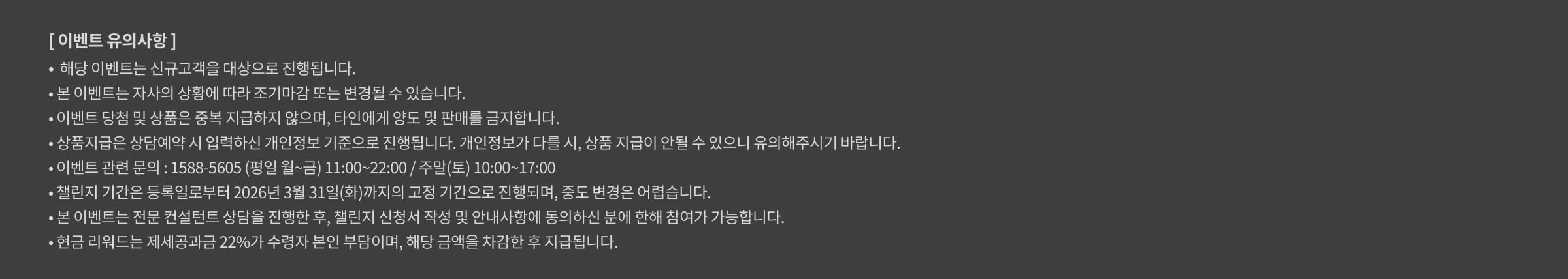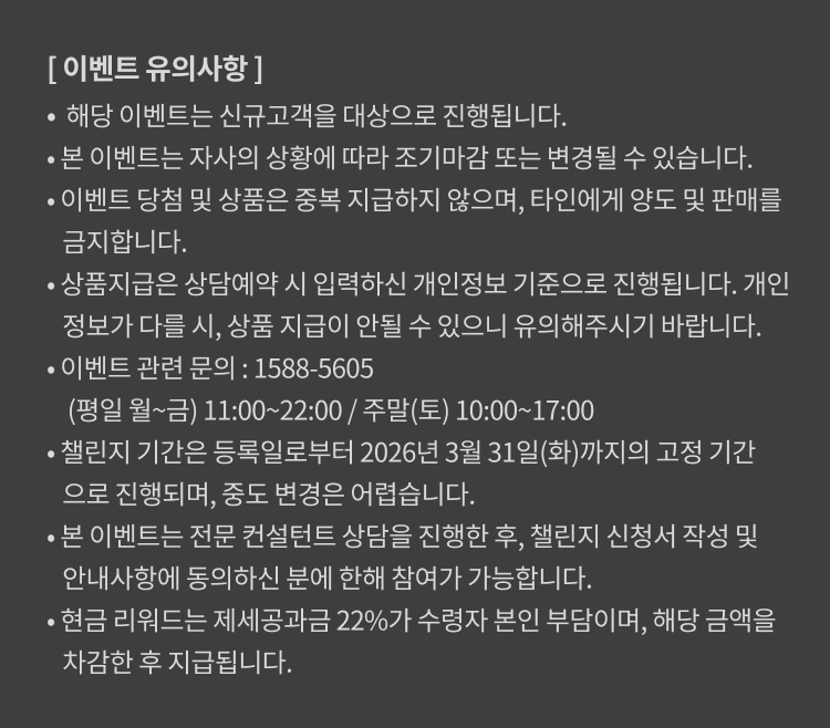 ※ 이용자는 개인 정보 수집 및 이용에 동의하지 않을 권리가 있으며, 동의를 거부할 경우에도 상담 및 서비스, 이벤트, 프로모션 참여 기회 이용에 제한이 없습니다.